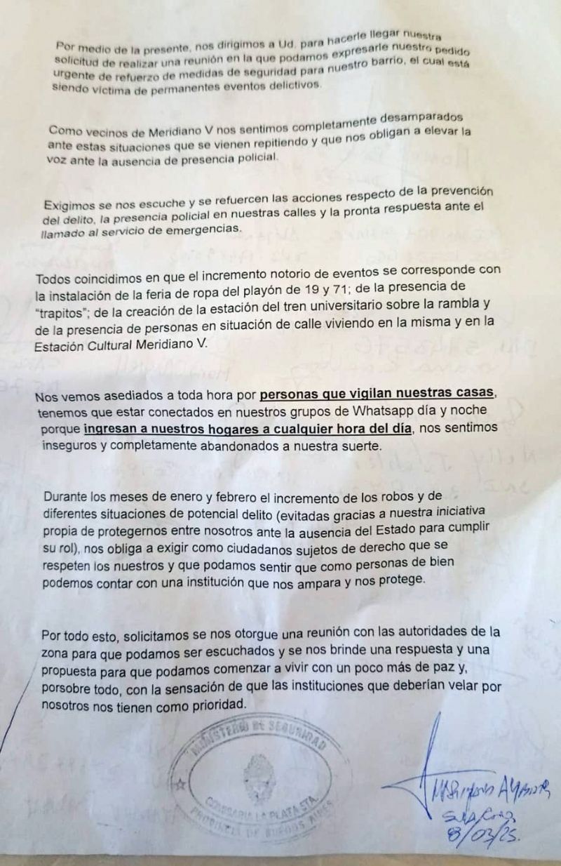 Un grupo de vecinos auto convocados del barrio platense Meridiano V se hartó del flagelo de la inseguridad en la zona y después de juntar firmas presentaron un petitorio en la comisaría 5ta, la Departamental de calle 12 entre 60 y 61 y la secretaría de Seguridad del municipio gobernado por Julio Alak.