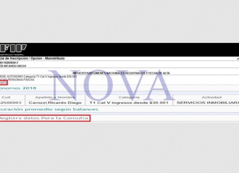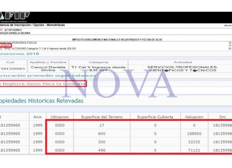 Su situación con la Administración Federal de Ingresos Públicos, está como autónomo y señala que paga hasta 30 mil pesos, pero nunca presentó una facturación, tanto en el 2018 como en el 2019. Lo raro de todo esto es que aparece con el IVA exento, algo que tendría que abonar.