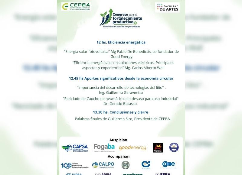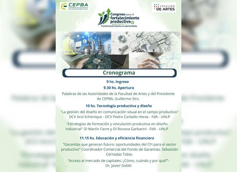 La Confederación Económica de la Provincia (CEPBA) realizará este jueves 18 desde las 9 horas el “Congreso para el Fortalecimiento Productivo”, en la sede de la Facultad de Artes de la UNLP, en Diagonal 78 Nº 680.