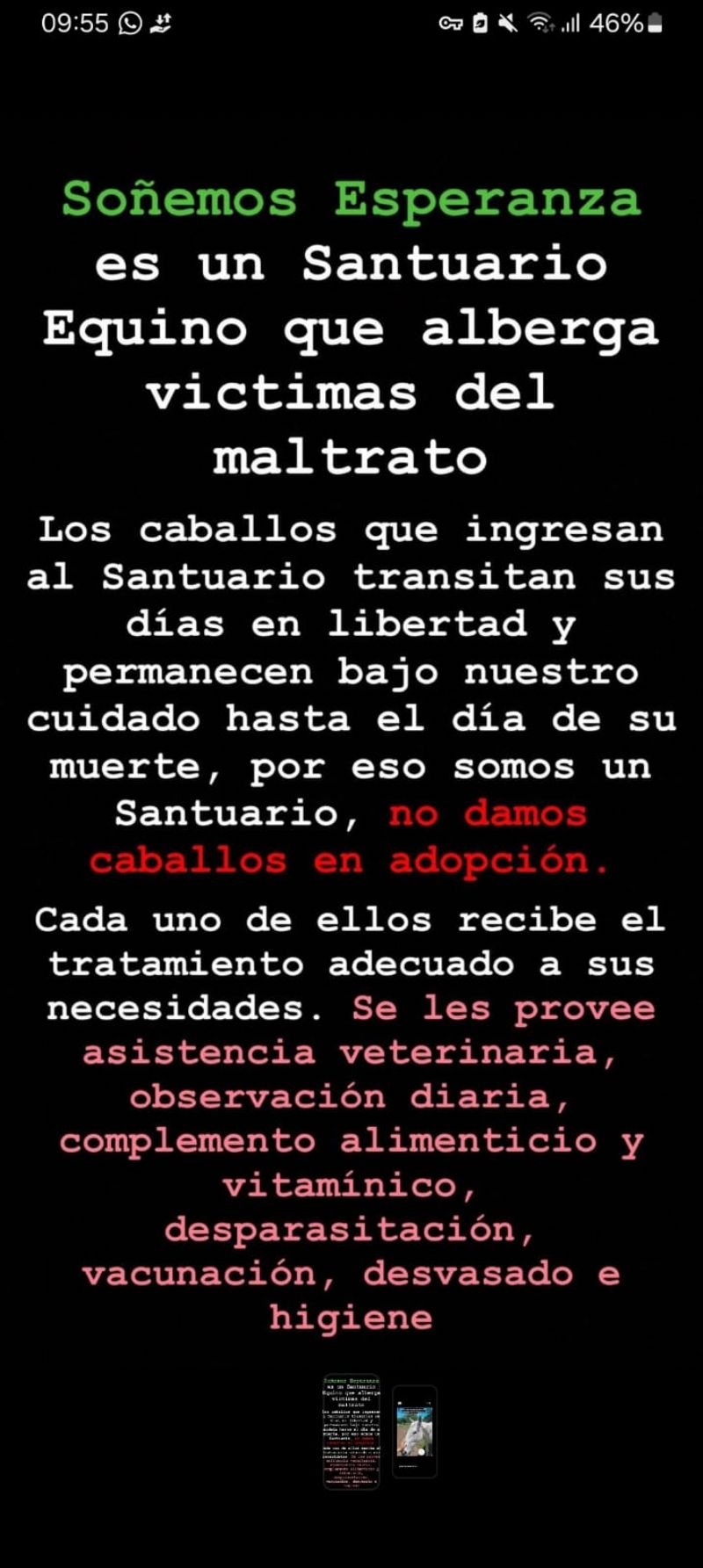 Ella trabaja desinteresadamente en función a un objetivo: rescatar caballos maltratados que fueron abandonados a su suerte. A través de su santuario llamado Soñemos Esperanza, @sonemosesperanza en Instagram, junto con su familia se ocupa de darle amor y cariño a estos animales que, no tuvieron una óptima calidad de vida. Si bien intenta cumplir con todos los requisitos para que todos ellos se encuentren bien, la difícil situación económica que hay en la actualidad le generó un drama que no le permite estar tranquila y recurre a la solidaridad de la comunidad.